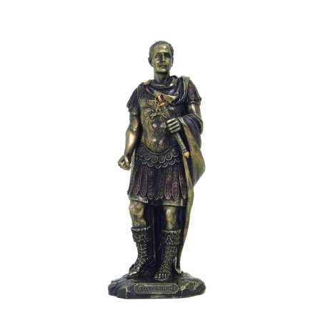 Statua di Giulio Cesare in resina bronzata, rifinita a mano in ogni dettaglio. Gaio Giulio Cesare è stato un militare, politico, console, dittatore, pontefice massimo, oratore e scrittore romano, considerato uno dei personaggi più importanti e influenti della storia. Fu il più famoso politico, storico, scrittore e figura militare romana nella storia e la persona più influente nell'ascesa dell'Impero Romano. Cesare era il dittatore di Roma ed il primo imperatore, fino alla sua morte alle Idi di Marzo per mano di un gruppo di senatori ribelli, che lo pugnaleranno a morte. Era famoso per i commentari militari "De Bello Gallico" e "De Bello Civili".