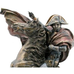 Statua in resina bronzata di Napoleone Bonaparte che cavalca un cavallo. Una delle più note statue da condottiero. Rifinita a mano in ogni dettaglio. Napoleone Bonaparte è stato un politico e generale francese, fondatore del Primo Impero francese e protagonista della prima fase della storia contemporanea. Napoleone Bonaparte (1769 - 1821) fu generale durante la Rivoluzione Francese, il dominatore della Francia come Primo Console e, dal 1804 al 1814, Imperatore di Francia. Nel 1799 Jacques-Louis David fu incaricato di dipingere questo quadro. Mentre Napoleone attraversava le Alpi su di un mulo, richiese di essere "ritratto calmo su un cavallo selvaggio". L'attraversamento del Passo del San Bernardo ha permesso alla Francia di sorprendere l'esercito Austriaco e vincere la Battaglia di Marengo nel 1800.